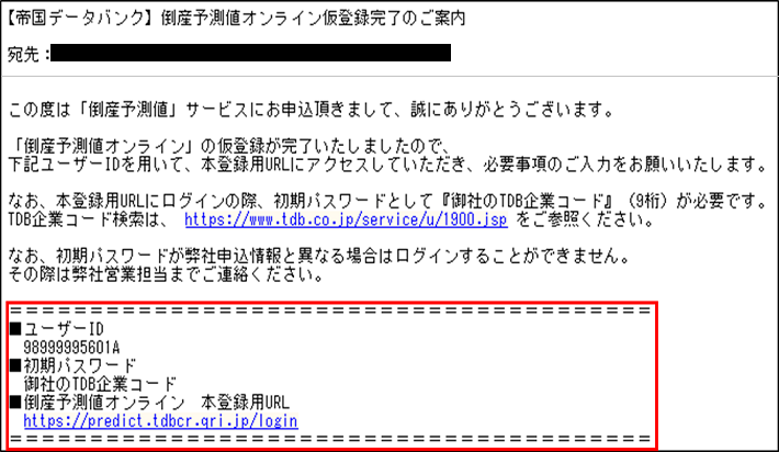 事前にお申込書で登録いただいたメールアドレス宛に 【帝国データバンク】倒産予測値オンライン仮登録完了のご案内 をお送りしておりますので、記載のURLより予測値オンラインへのアクセスをお願いいたします。